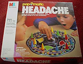 Headache is a board game similar to Trouble in which the object is to land on top of all your opponent's pieces (known as "cones"). The game is distinct from Trouble in that there is no finish the player must reach. Play moves in circles, until only one player has cones remaining on the board, being declared the winner; i.e., it is a running-fight game. All players are welcome to occupy any space throughout the game, provided die roll allows, and there are eight spaces that serve as "safe" spots, where a cone resting on this space cannot be captured. Captured pieces are not sent back to start, but are permanently lost.